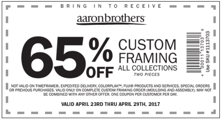 Details: Get 65% off Custom Framing - all Collections Two Pieces. One coupon per customer per day