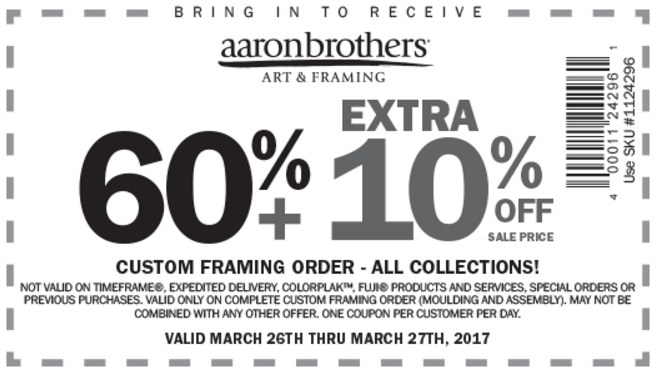 Details: Get 60% off Custom framing- all collections one piece. One coupon per customer per day