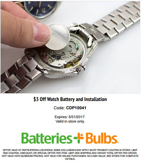 Details: Get $3 Off Watch Battery & Installation. Offer valid at participating locations. Limit One Coupon, Discount, or Special Offer Per Item. Limit One shipping and Order total offer per order.
