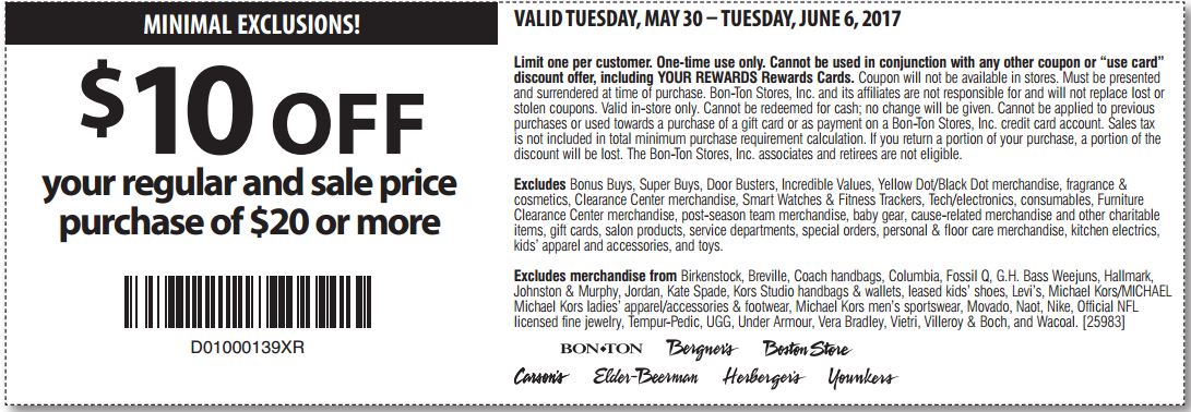 Details: Get $10 off regular and sale price purchase of $20 or more. Limit one per customer.