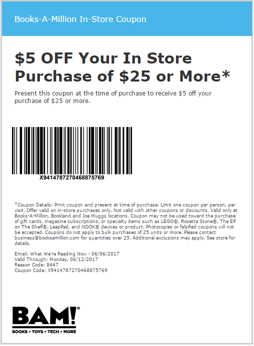 Details: Get $5 off Your In Store Purchase of $25 or More. Limit one coupon per person, per visit. Valid only at Books-A-Million, Bookland and Joe Muggs locations.