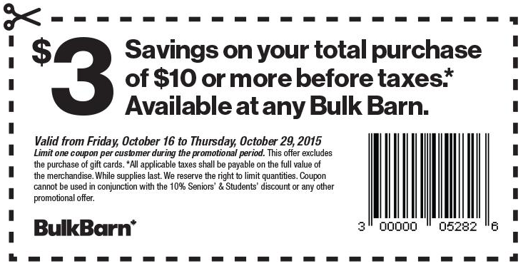 Details: Save $3 on your purchase of $10 or more. Available at all Bulk Barn locations.
