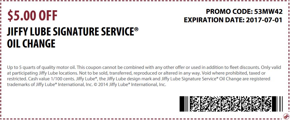 Details: Get $5 Off Jiffy Lube Signature Service Oil Change. Up to 5 quarts of quality motor oil. Only valid at participating Jiffy Lube locations.