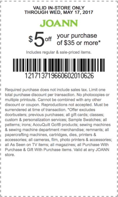 Details: Get $5 Off Your Purchase of $35 or more. Includes regular- & sale-priced items. Limit one total purchase discount per transaction.
