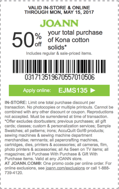 Details: Get 50% off your total purchase of Kona cotton solids includes regular & sale-priced items.