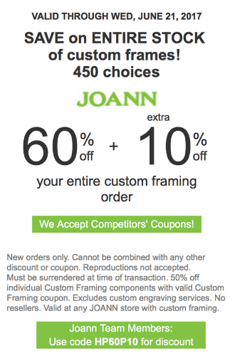 Details: Get 60% off + Extra 15% off your entire custom framing order. Valid for new orders only.