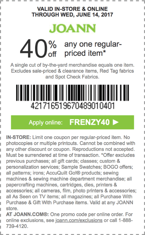 Details: Get 40% Off Any One Regular Priced Item. Limit one coupon per regular-priced item. A Single cut of by-the-yard merchandise equals one item.