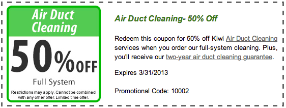 Details: Redeem this coupon for 50% Off Kiwi Air Duct Cleaning Services When You Order The Full-System Cleaning. Expires 4/30/13.