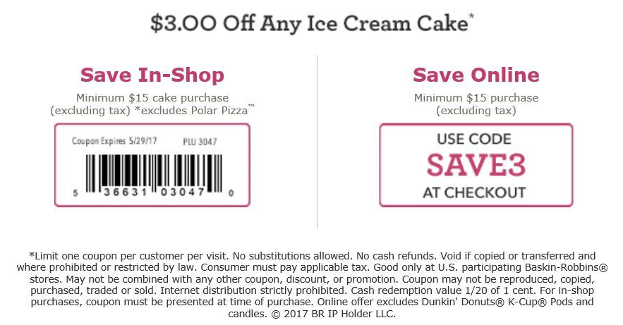 Details: Save $3 On Any $15+ Ice Cream Cake Purchase. Limit One Coupon Per Customer Per Visit.