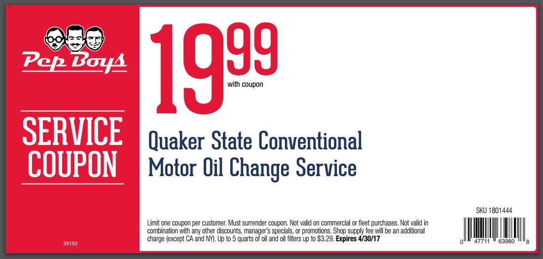 Details: Get Quaker State Conventional Oil Change service for $19.99. Limit one coupon per customer. Up to 5 quarts of oil and oil filters up to $3.29