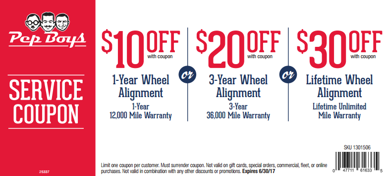 Details: Get $10 off 1-Year Wheel Alignment 1-Year 12,000 Mile Warranty or $20 off 3-Year Wheel Alignment 3-Year 36,000 Mile Warranty or $30 off Lifetime Wheel Alignment Lifetime Unlimited Mile Warranty. Limit one coupon per customer