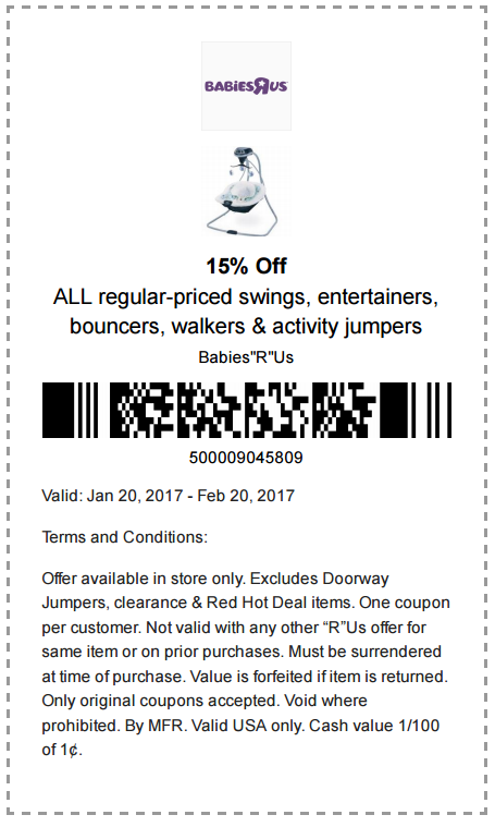 Details: Get 15% Off All Regular-Priced Swings, Entertainers, Bouncers, Walkers & Activity Jumpers. One coupon per customer.