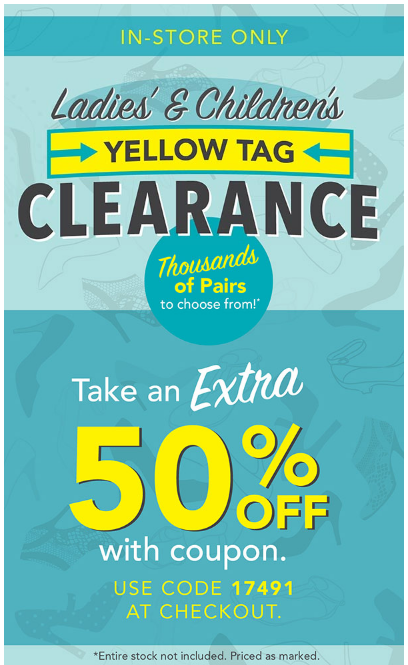 Details: Yellow tag clearance sale! 60% off or more ladies shoes with coupon. Entire stock not included in clearance sale. Clearance items marked with yellow tickets. 20% coupon on white and yellow ticket items with normal exclusions