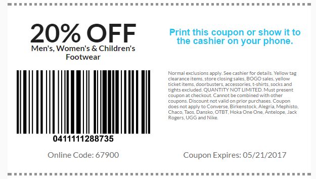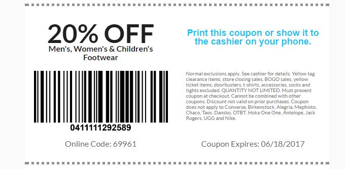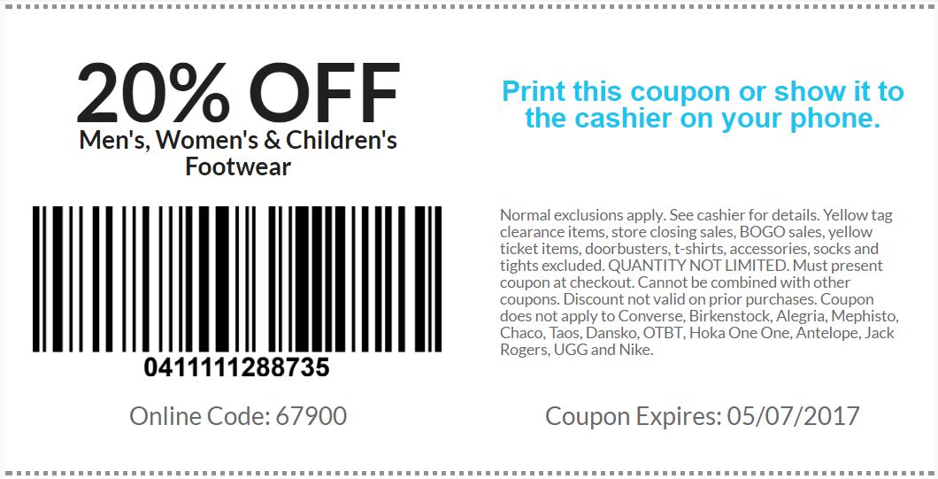 Details: Get 20% off Men's, Women's & Children's sale & regular priced Footwear.