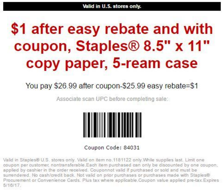 Details: Get Staples 8.5 inch x 11 inch Copy plus paper, ream for $0.01. after easy rebate. Limit one coupon per customer. Valid on item no. 122408
