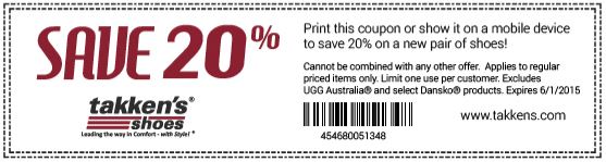 Details: Get 20% Off a new pair of shoes! Applies to regular priced items only. Limit one use per customer. Excludes UGG Australia and select Dansko products. Expires on 6/1/15.